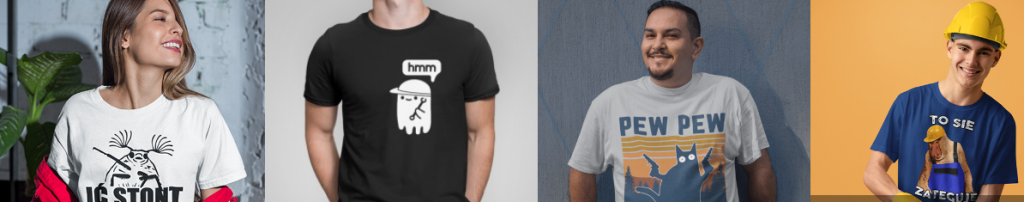 • Personalizacja jako standard – każdy użytkownik może wybrać produkt (koszulka, bluza, czapka) i wgrać własną grafikę lub skorzystać z dostępnych szablonów, dopasowując kolor, rozmiar i rozmieszczenie nadruku.