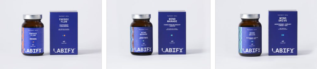 Na stronie marki Labify dostępna jest rozbudowana oferta suplementów diety posortowanych według kategorii: „Energia i Regeneracja”, „Spokój i Energia”, „Funkcjonalne rośliny + grzyby” oraz „Metabolizm i hormony”. W każdej z tych kategorii można znaleźć szczegółowe opisy: składniki aktywne, ich dawki, sposób użycia, możliwe przeciwwskazania. Na przykład zestaw „Energia i Regeneracja” łączy adaptogeny, magnez, witaminę D3+K2 i kwercetynę, by wspierać metabolizm energetyczny, układ nerwowy, kości i mięśnie. Ponadto strona marki Labify oferuje blog i newsletter, w którym użytkownicy mogą poszerzyć wiedzę o suplementacji, stylu życia i zdrowiu. Produkty są opisane szczegółowo, co pozwala klientowi świadomie dobierać preparaty do swoich potrzeb.